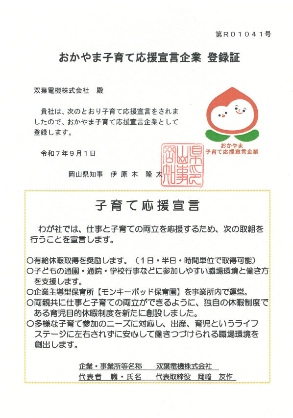 「おかやま子育て応援宣言企業」は、従業員の子育てや地域における子育てを応援するための具体的な取組を企業・事業所等に宣言をすることで、県が登録する制度です。双葉電機は社内に保育園を併設し、社員の子どもはもちろん、地域の子どもの預かり保育も行っています。こういった活動の中で双葉電機は「おかやま子育て応援宣言企業」に認定されました。